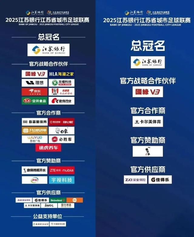 苏超赞助商名单,左图为最新版本,右图为第一轮比赛时版本。地方赛区招商火热,烟火气小商家成球场特色